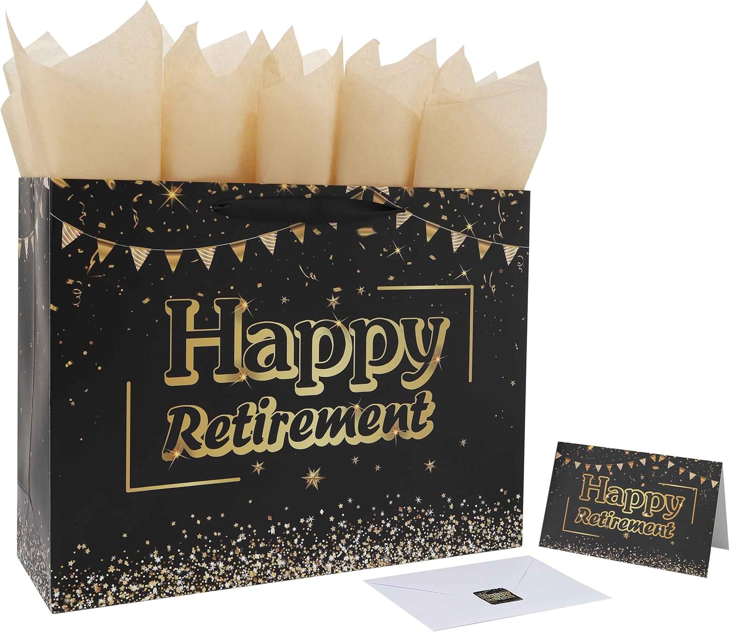 UNIQUE DESIGN: The elegant reward bag options the textual content ‘Completely satisfied Retirement’ in shimmering gold, framed by golden confetti and star particulars that add a contact of festivity and sophistication. A string of gold bunting runs alongside the highest, symbolizing a well-deserved celebration and the beginning of a brand new chapter.