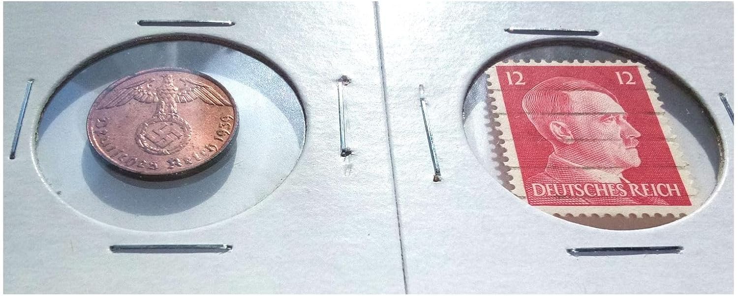 1938 DR AMAZON SPECIAL! Uncommon NAZI BRONZE COIN w Swastika + NAZI STAMP w Hitler! 2-Sided Show Holder 1 Pf (coin) 1-24 Pf (stamp) Vendor XF